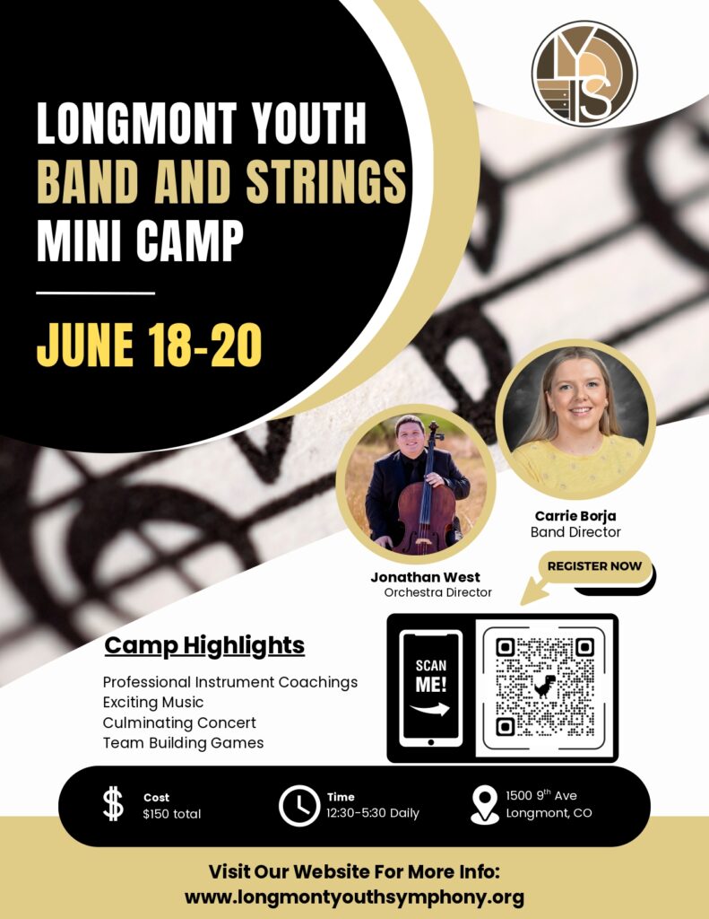 ¡Este mes de junio, la Orquesta Sinfónica Juvenil de Longmont organiza su tercer minicampamento anual de viento y cuerda! Este campamento está abierto a cualquier persona con un año de experiencia musical, hasta estudiantes que acaben de terminar 3.º de ESO. El campamento está dirigido por la Sra. Carrie Borja y el Sr. Jonathan West.