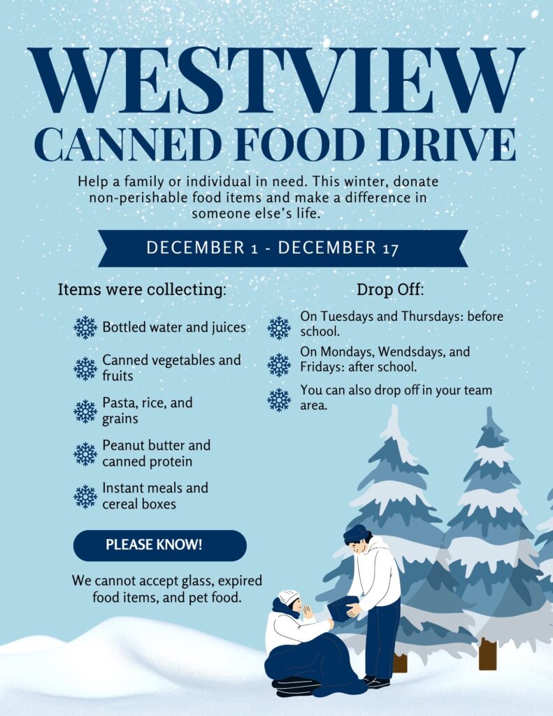 Join us in making a difference. Westview Middle Schools canned food drive will begin on December 1st. Every donation will help support our community.